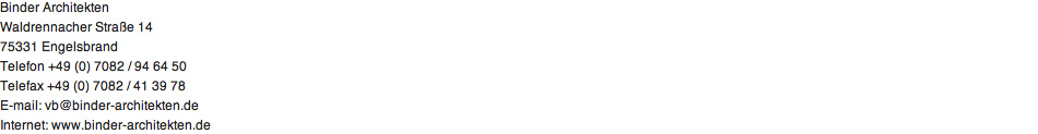 Binder Architekten behält sich das Recht vor, diese Erlaubnis jederzeit zu widerrufen. Ohne vorherige schriftliche Genehmigung von Binder Architekten dürfen diese Dokumente/Webseiten nicht vervielfältigt, archiviert, auf einem anderen Server gespeichert, in Newsgruppen einbezogen, in Online-Diensten benutzt oder auf einer CD-ROM gespeichert werden.